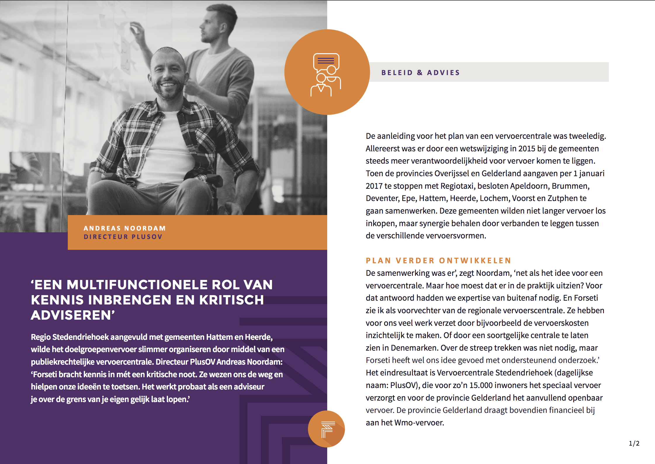 ‘De samenwerking was er’, zegt Noordam, ‘net als het idee voor een vervoercentrale. Maar hoe moest dat er in de praktijk uitzien? Voor dat antwoord hadden we expertise van buitenaf nodig. En Forseti zie ik als voorvechter van de regionale vervoerscentrale. Ze hebben voor ons veel werk verzet door bijvoorbeeld de vervoerskosten inzichtelijk te maken. Of door een soortgelijke centrale te laten zien in Denemarken. Over de streep trekken was niet nodig, maar Forseti heeft wel ons idee gevoed met ondersteunend onderzoek.’ Het eindresultaat is Vervoercentrale Stedendriehoek (dagelijkse naam: PlusOV), die voor zo’n 15.000 inwoners het speciaal vervoer verzorgt en voor de provincie Gelderland het aanvullend openbaar vervoer. De provincie Gelderland draagt bovendien financieel bij aan het Wmo-vervoer.